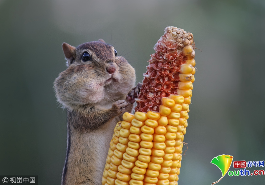 2010年9月,加拿大安大略湖,一只花栗鼠在啃食玉米,腮帮子鼓鼓的。