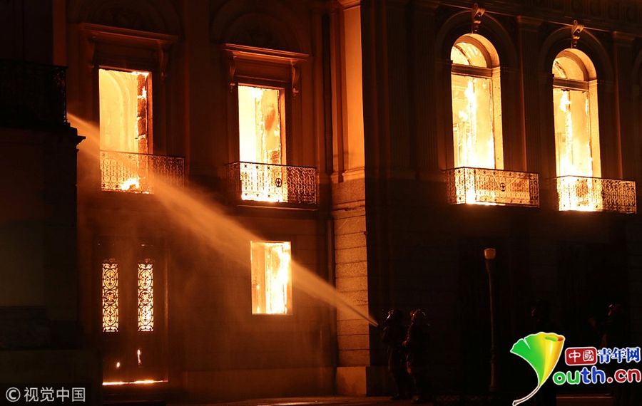 9月2日,在巴西里约热内卢,消防员在火灾现场灭火。 位于里约热内卢市北区、拥有2000万件藏品的巴西国家博物馆2日晚发生火灾,由于火势难以控制,所有藏品恐已被烧毁。 新华社记者李明摄