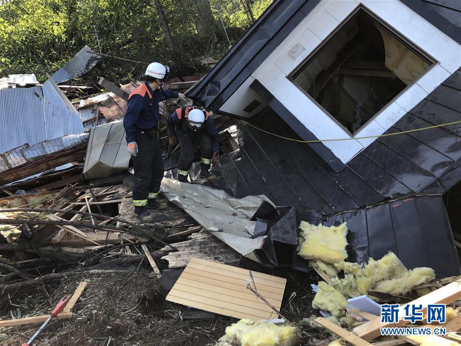9月6日,在日本北海道厚真町,救援人员在一处倒塌的房屋附近搜救。
