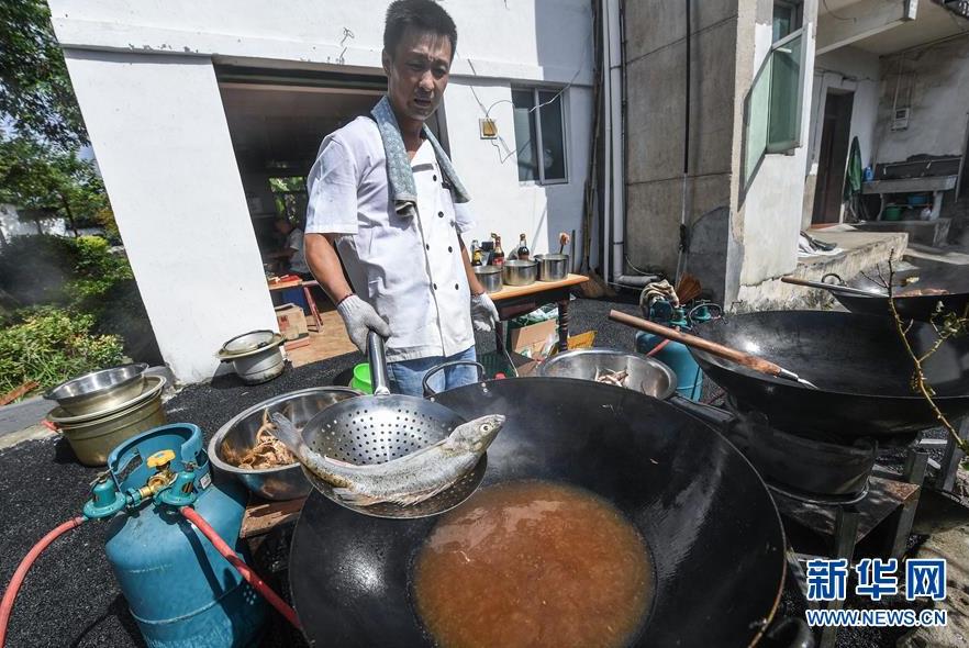 9月18日,村民在烹饪刚刚捕捞上来的江鲜。