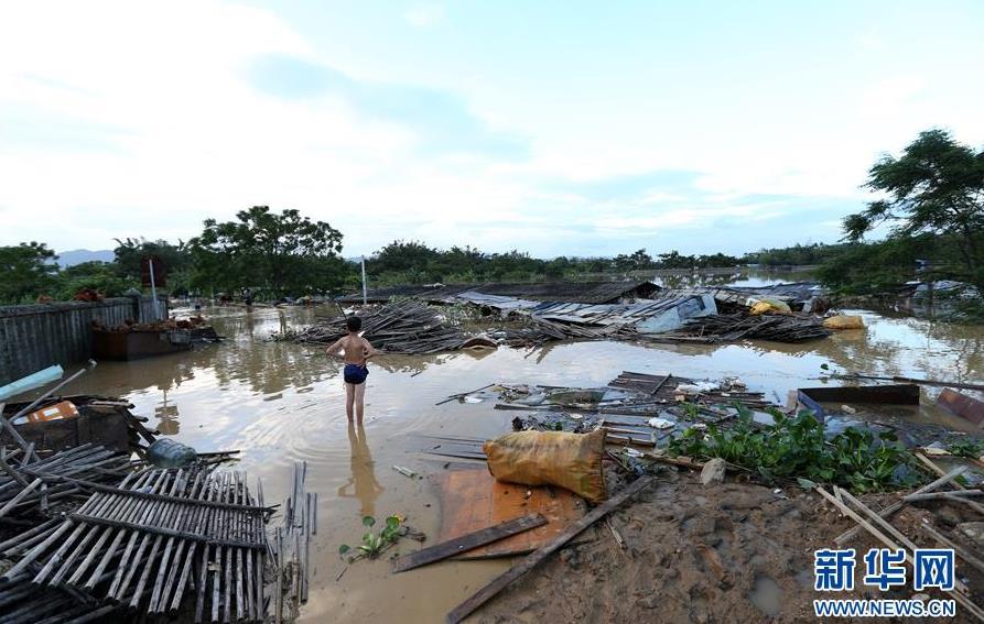 9月18日,在广东省阳江市阳春市,一名儿童站在水浸的村庄里。 新华社记者张加扬摄