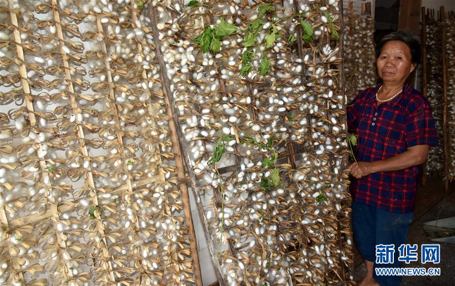 9月18日,在广东省阳江市阳春市陂面镇,村民谢芳英在收拾从水中捞上来的蚕茧。 新华社记者 周科 摄