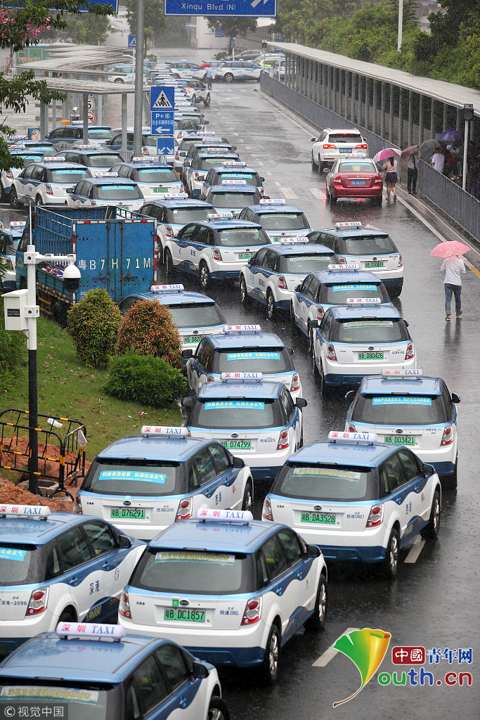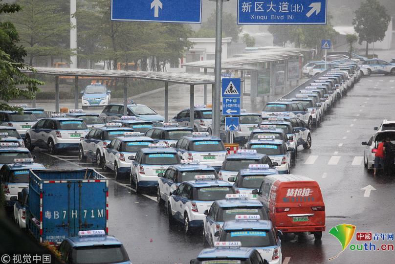 2018年9月16日,受台风山竹影响,全市的电动车充电站暂停使用。深圳市民乐P+R停车场外,停满了等待充电站开门的电动出租车。