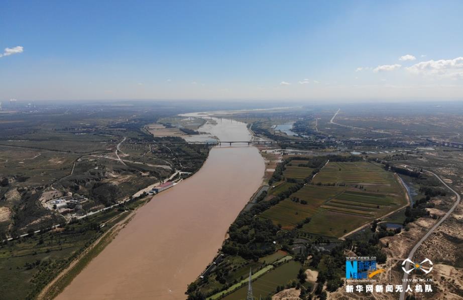 航拍黄河托克托段两岸风光,大河奔流向天际。新华网 张伟 摄