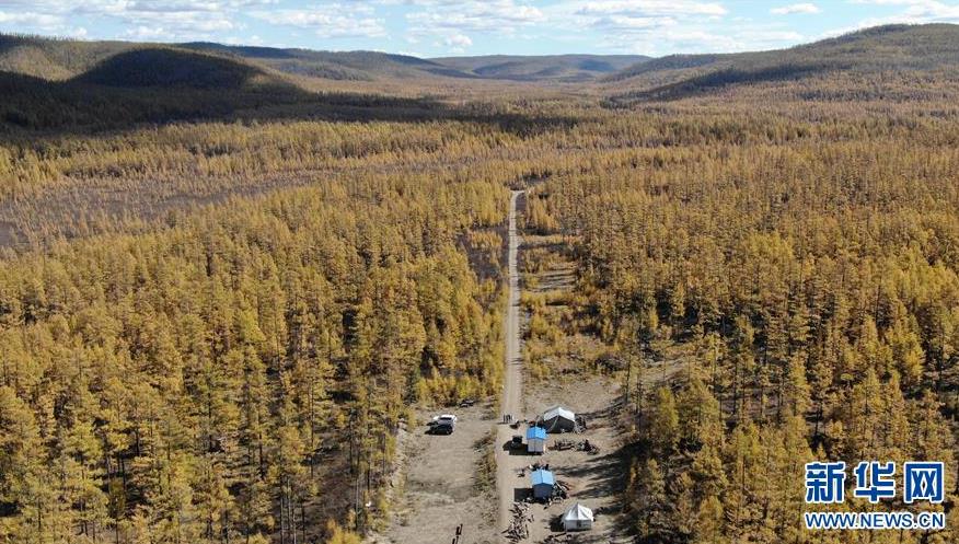 9月18日,在内蒙古大兴安岭根河林业局约安里林场,林场职工在河套取生活用水(无人机拍摄)。新华社记者李任滋摄