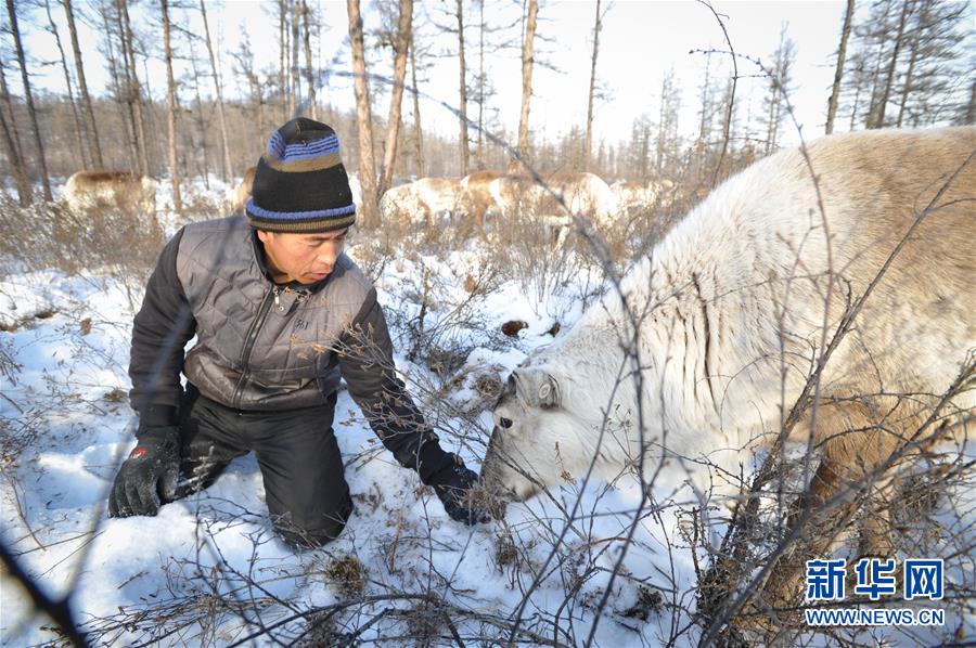 在内蒙古大兴安岭根河林业局约安里林场,林场职工张国华在喂养驯鹿(2017年12月23日摄)。新华社记者李任滋摄