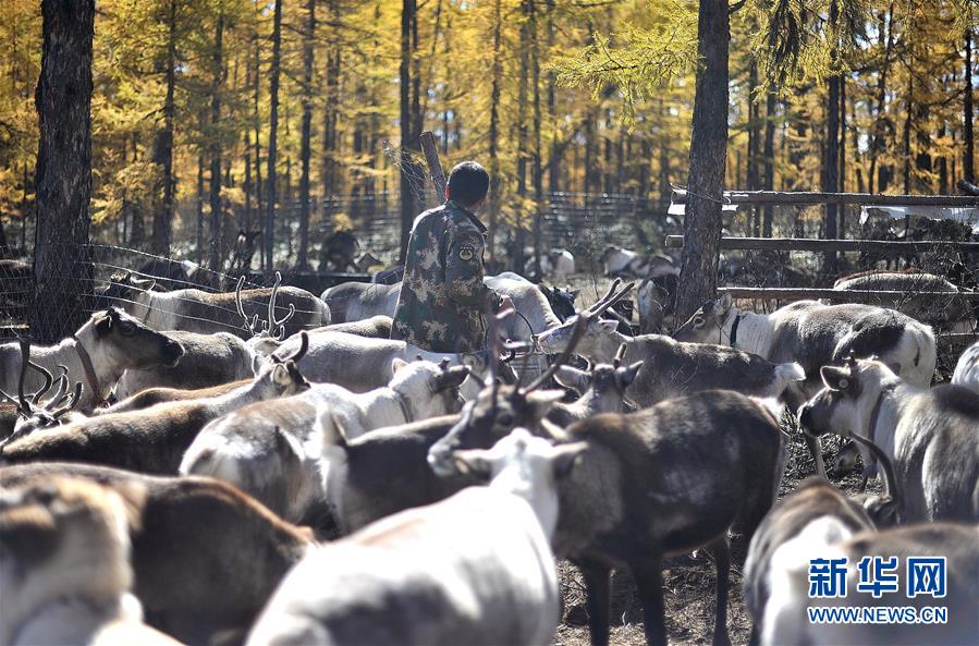 9月18日,在内蒙古大兴安岭根河林业局约安里林场,林场职工廉立臣在鹿圈补充饲料。新华社记者于洋摄