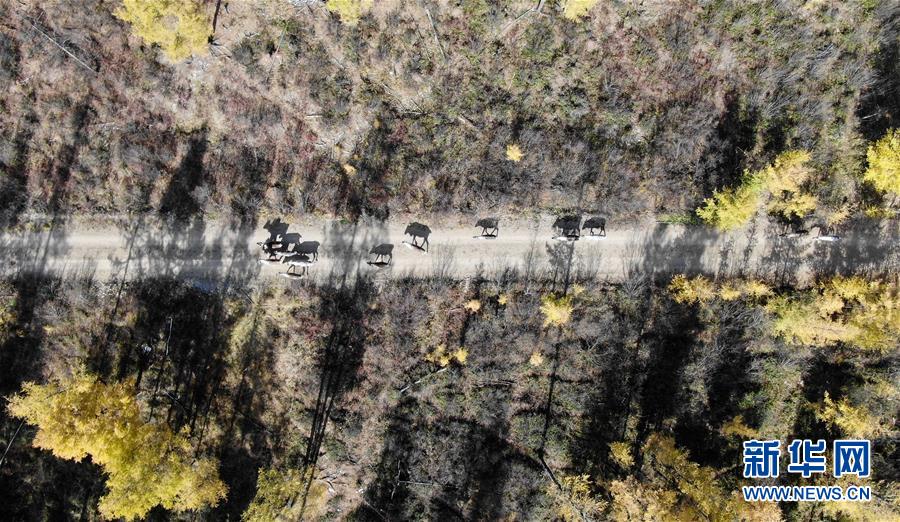 内蒙古大兴安岭根河林业局约安里林场里的驯鹿(9月18日无人机拍摄)。新华社记者李任滋摄
