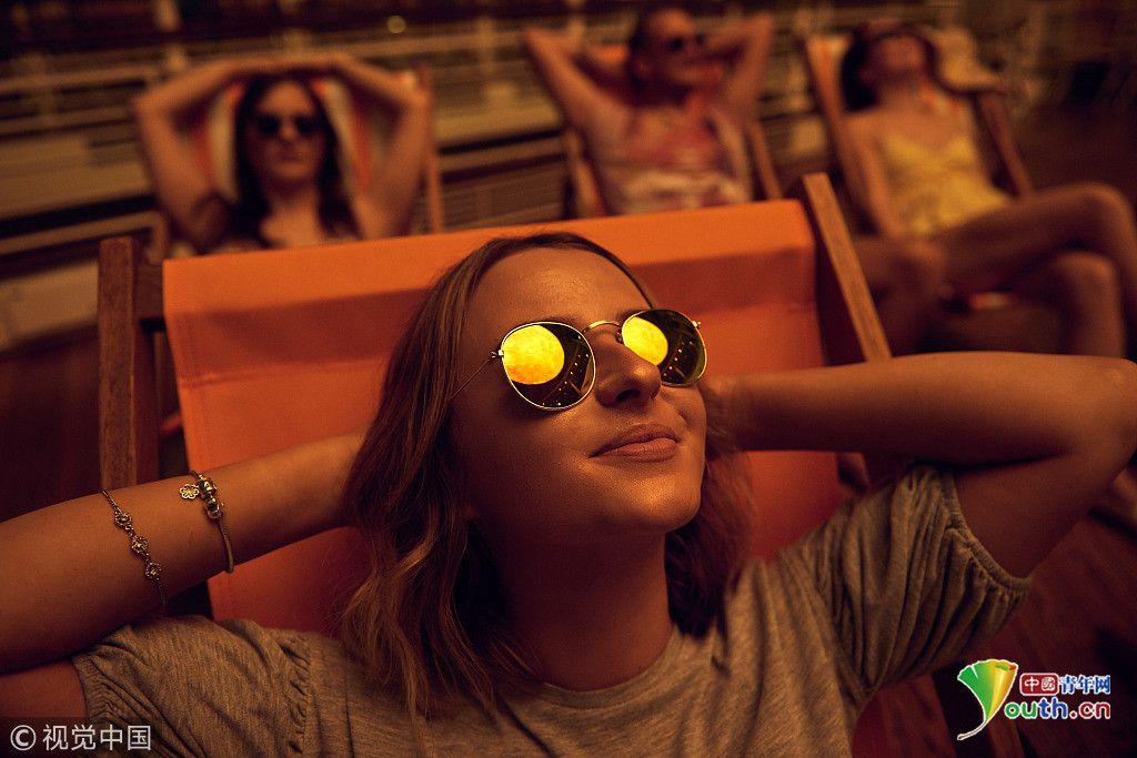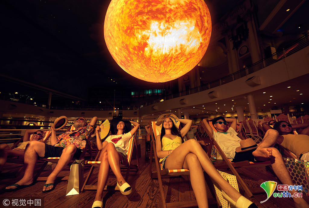 当地时间2018年9月18日,英国曼切斯特,顾客们在特拉福德购物中心的一个巨型的“太阳”下享受室内日光浴,感受英国未完的史上最热夏天。这个人造“太阳”的亮度相当于1.2万个灯泡。图片来源:视觉中国