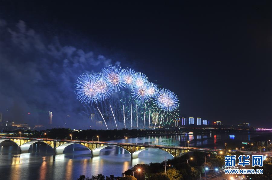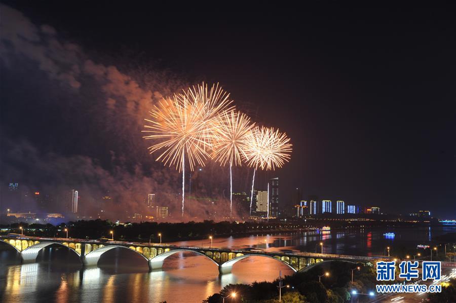 9月19日晚,湖南省长沙市在湘江橘子洲举办焰火晚会,绚丽的焰火与湘江两岸的城市夜景交相辉映。