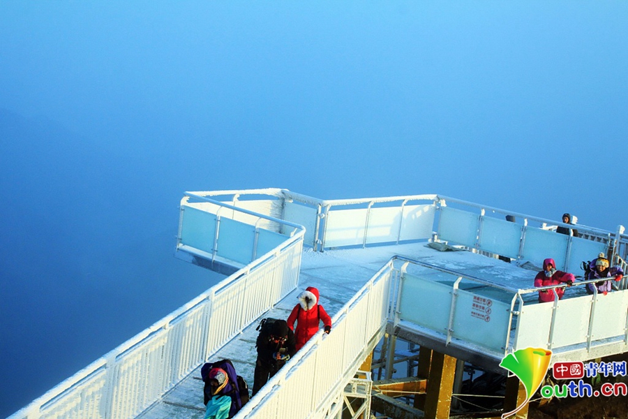 上到金子山最高峰可以看到,玻璃天梯像一条巨龙,沿着金子山最高峰山腰蜿蜒而上,每一个阶梯都是玻璃做的,顶上是蓝天白云,四周是莽莽群山,天梯下面是深不可测的悬崖绝壁。