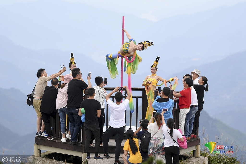 长三角第一高峰上演高空钢管舞 舞者演绎“嫦娥奔月”
