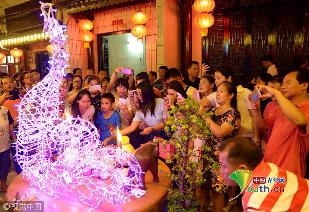 2016年9月15日晚,广西来宾市忻城县城关镇城厢街举行中秋节供月扎彩灯(走马灯)民俗活动,5万余名区内外游客涌入老街,体验独特的文化魅力和民俗风情,人们在老街内赏月、赏花灯、品美食、拍照,流连忘返。