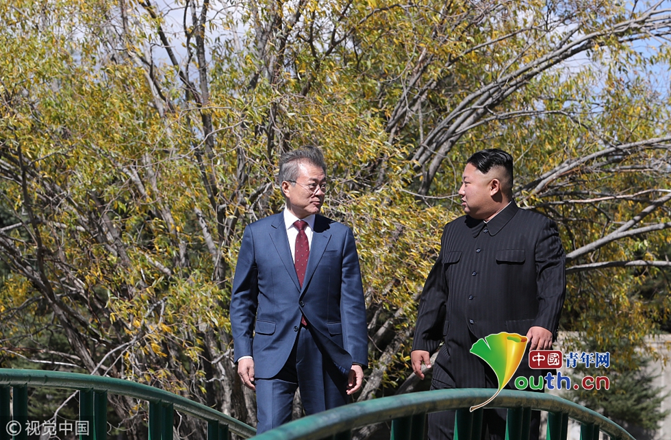 当地时间2018年9月20日,朝鲜,韩国总统文在寅和朝鲜领导人金正恩在三池渊招待所共进午餐后散步。图片作者:Yonhap News Agency/视觉中国