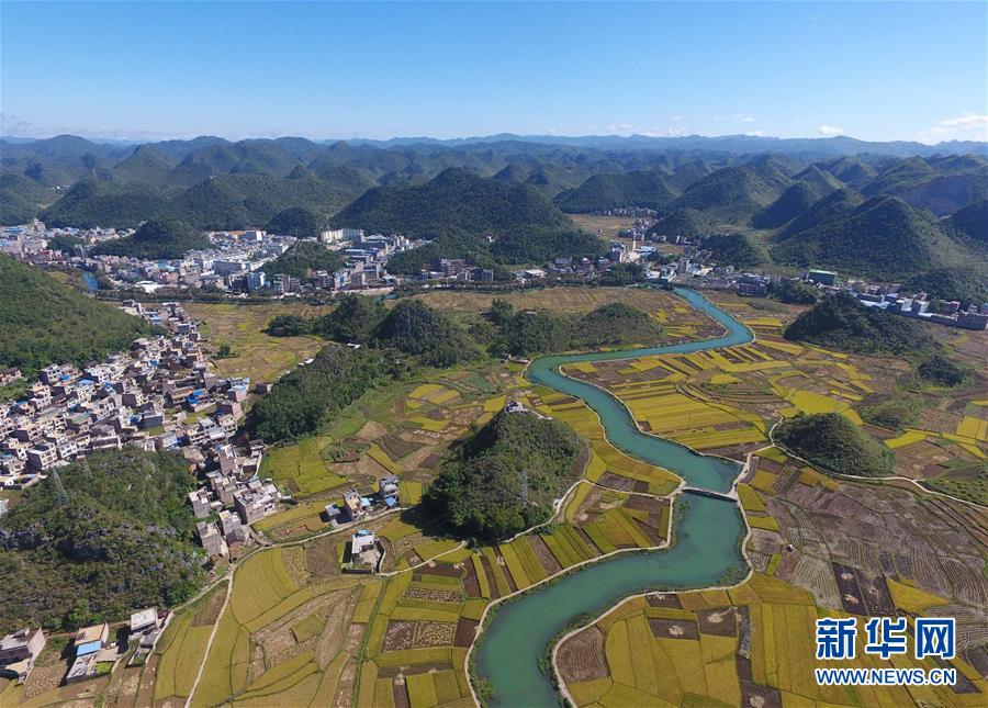 这是广南县八宝镇坝龙村的田园景色(9月20日无人机拍摄)。 云南省文山壮族苗族自治州广南县八宝镇今年种植优质水稻22000余亩,秋收季节,田野里一片金黄,景色如画。 新华社记者杨宗友摄