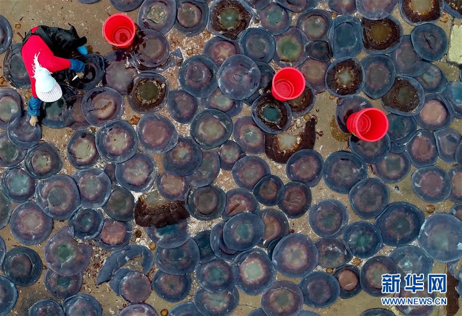 9月21日,滦南县南堡镇南堡二村一家海蜇养殖场的工人在海蜇卤制池内摆放海蜇(无人机拍摄)。新华社记者杨世尧摄