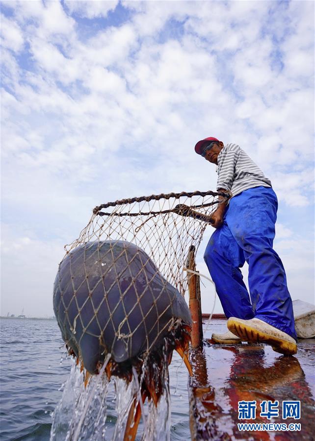 9月21日,滦南县南堡镇南堡二村一家海蜇养殖场的工人在养殖区打捞海蜇。新华社记者杨世尧摄