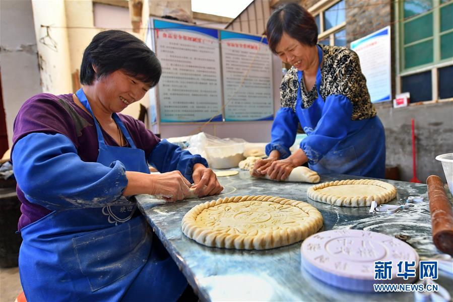 9月22日,段河村村民段粉拽(左)和段金花在制作月饼。 中秋节来临之际,山西省晋城市泽州县南岭乡段河村的段富善一家人忙碌起来,他们家制作的“柴火月饼”远近闻名。 “柴火月饼”起源于明清时期,馅料以糖搭配花生仁、芝麻、玫瑰等,有近10道制作工序,其中最有特色的是木柴烤制工艺,烘烤师傅必须掌握好火候,才能烤出外皮酥脆、馅料飘香的月饼。 新华社记者 曹阳 摄