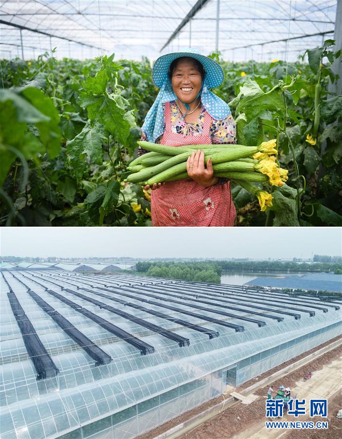 这张拼版照片显示的是:上图,9月21日,在江苏省响水县九丰现代高效农业示范园的大棚内,56岁的农民徐晓菊展示收获的丝瓜;下图,9月21日,徐晓菊(中)和村民一起搬运收获的丝瓜(无人机拍摄)。 新华社记者季春鹏摄