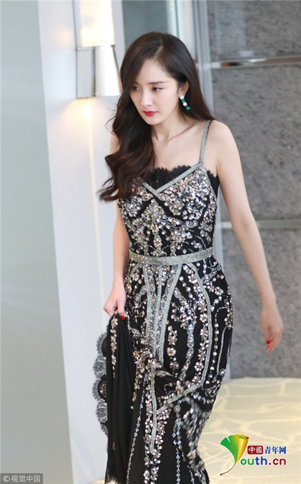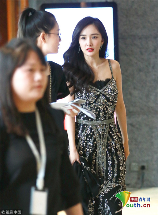 杨幂卷发成熟美露香肩 自提裙摆过酒店大堂