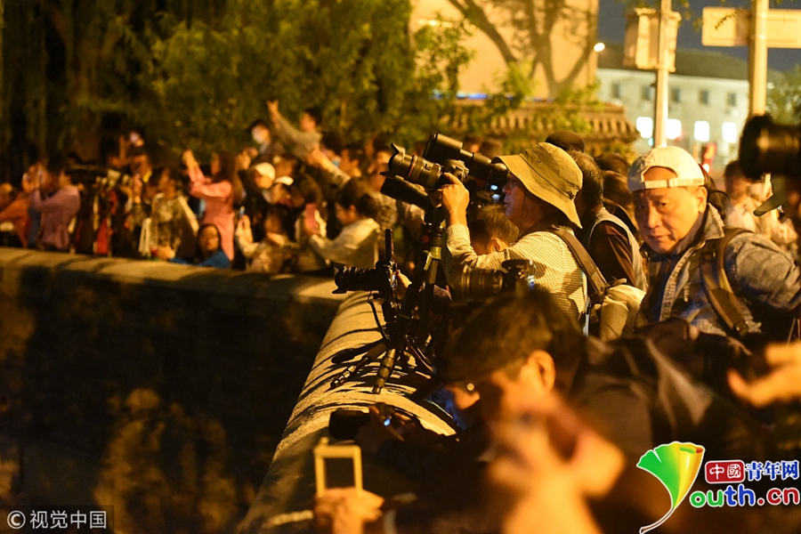 许多市民和摄影爱好者聚集故宫角楼下拍摄月亮。图片作者/视觉中国
