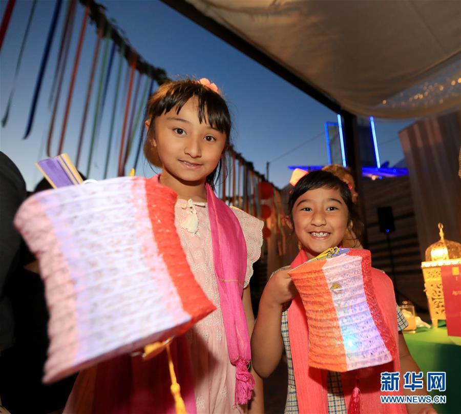 9月23日,在美国科斯塔梅萨南岸广场,两名儿童参加中秋游园会。 美国西部最大购物中心南岸广场23日晚举办游园会,庆祝中国传统节日中秋节。 新华社记者李颖摄