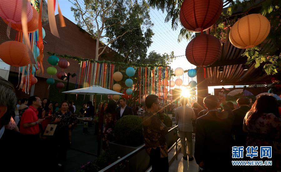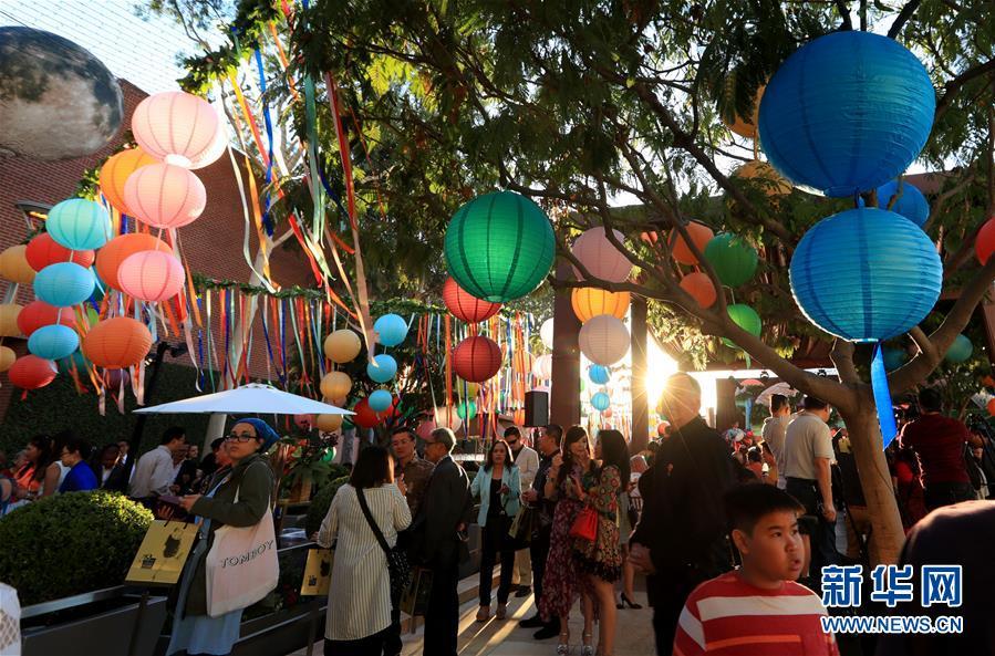 9月23日,在美国科斯塔梅萨南岸广场,人们参加中秋游园会。 美国西部最大购物中心南岸广场23日晚举办游园会,庆祝中国传统节日中秋节。 新华社记者李颖摄
