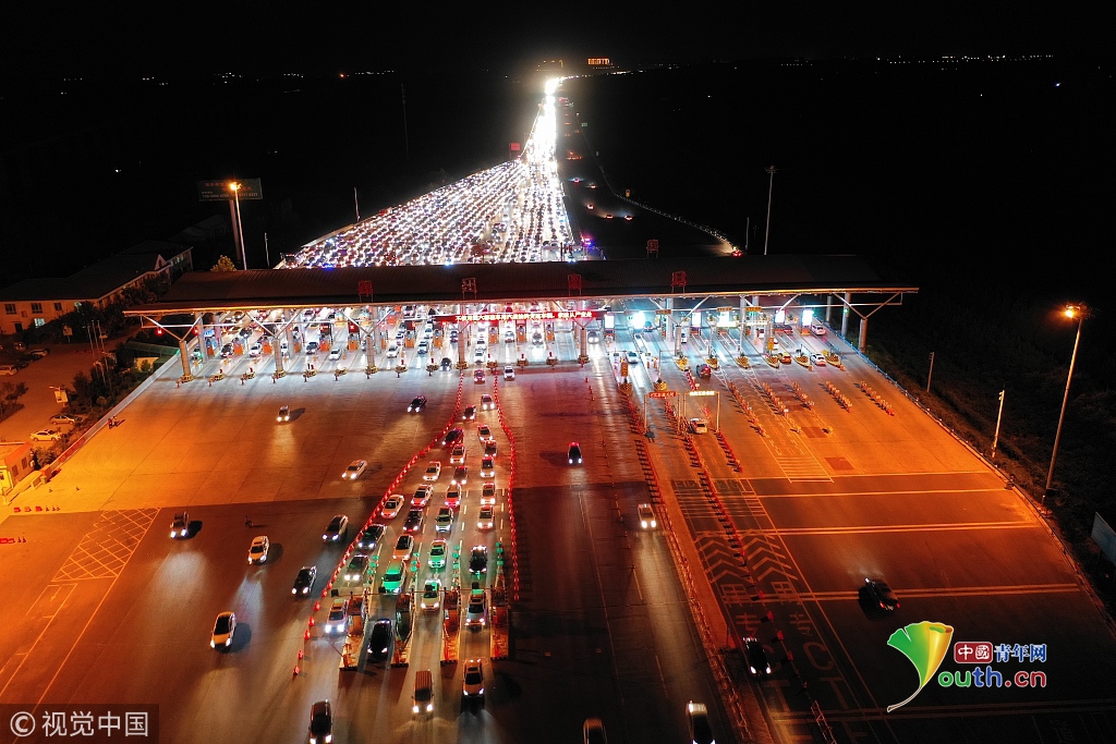 2018年9月24日,郑州,在河南郑州南收费站,排队出高速的汽车仍然排着长长的队伍。当天是中秋节小长假的最后一天,全国各地迎来返程客流高峰。