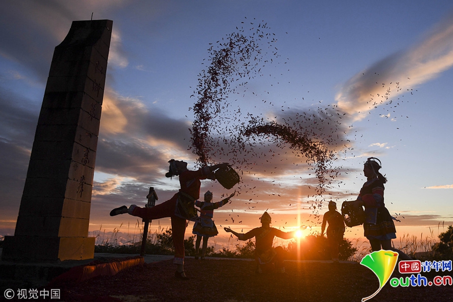 9月26日,长三角第一高峰浙江龙泉山农作物喜获丰收,当地农民与游客用8吨刚收获的辣椒以及玉米,在山顶的云海中拼出了一面长10米、宽6.6米的巨型国旗庆祝丰收。