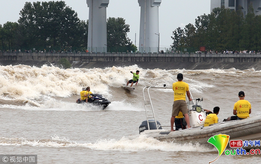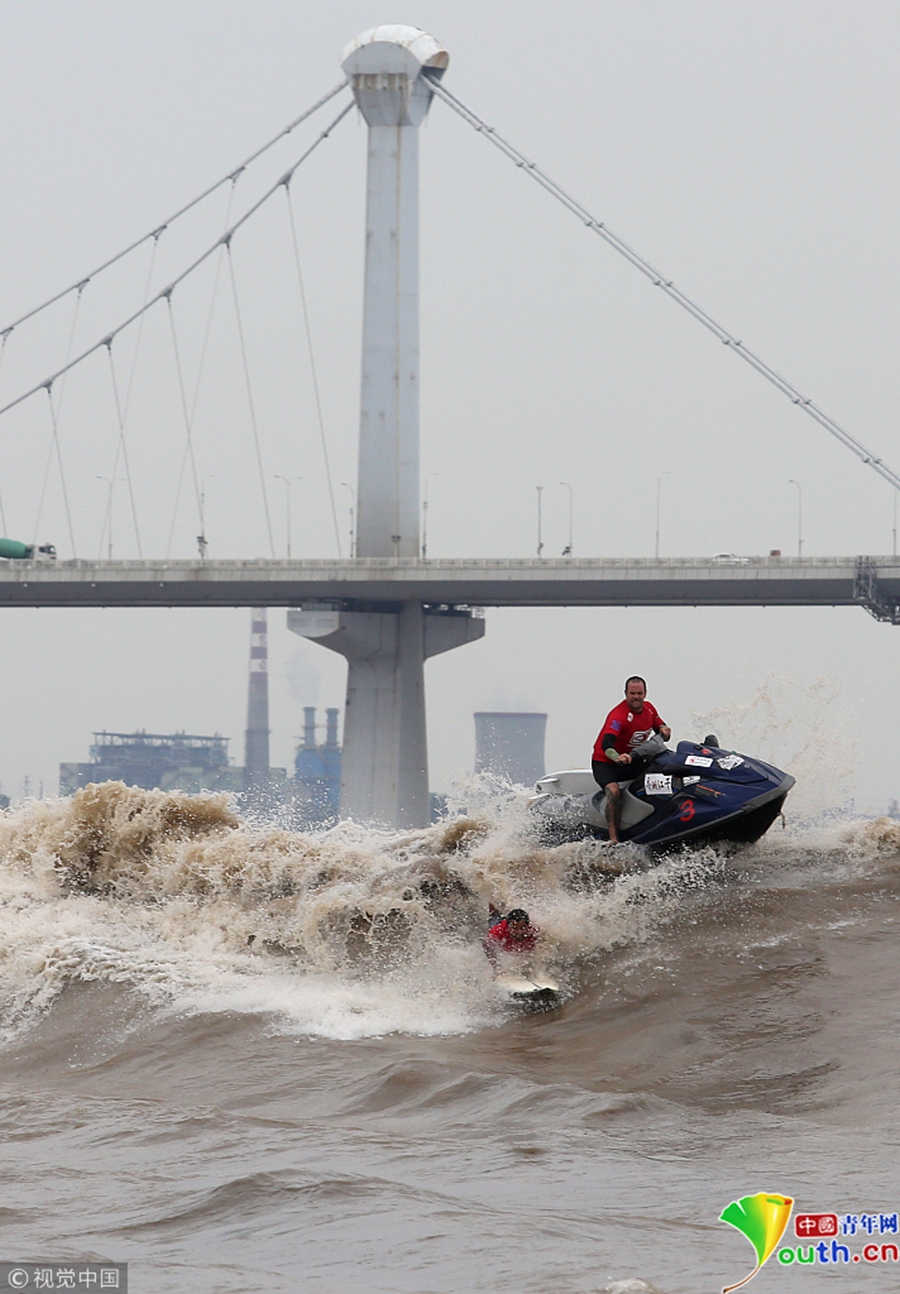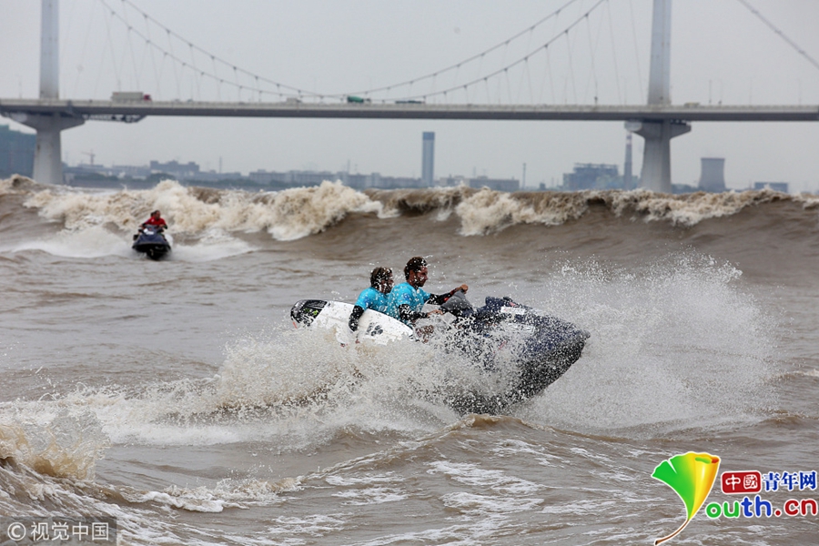 杭州钱江江面上,冲浪弄潮儿英姿飒爽。