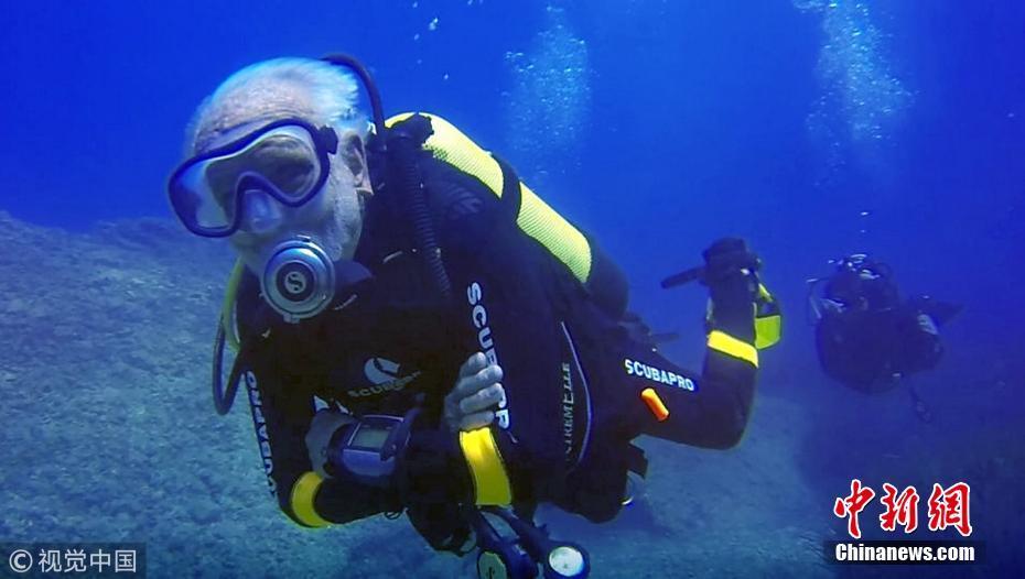 当地时间2018年9月1日,塞浦路斯,95岁的英国潜水员雷·伍利(Ray Woolley)以44分钟下潜40.5米的成绩打破了自己94岁达成的记录(41分钟下潜38.1米),二度刷新了世界上年龄最大的男性潜水员最好成绩。在此次下潜中,这位二战退伍老兵对距塞浦路斯南部城镇拉纳卡约2公里处的海域进行了探索,1980年一艘名为“芝诺比亚号”(Zenobia)的货船在这里进行首次航行时沉没。图片来源:视觉中国