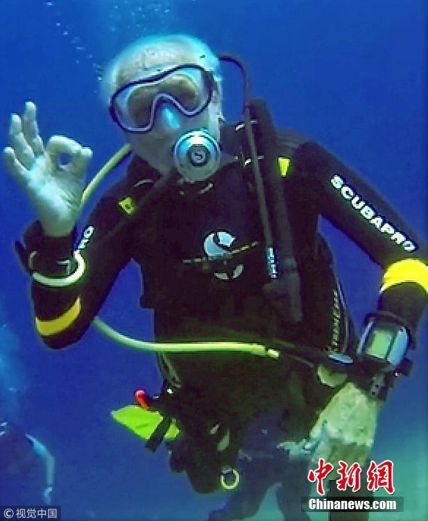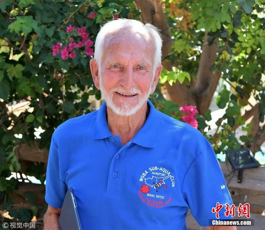 当地时间2018年9月1日,塞浦路斯,95岁的英国潜水员雷·伍利(Ray Woolley)以44分钟下潜40.5米的成绩打破了自己94岁达成的记录(41分钟下潜38.1米),二度刷新了世界上年龄最大的男性潜水员最好成绩。在此次下潜中,这位二战退伍老兵对距塞浦路斯南部城镇拉纳卡约2公里处的海域进行了探索,1980年一艘名为“芝诺比亚号”(Zenobia)的货船在这里进行首次航行时沉没。图片来源:视觉中国
