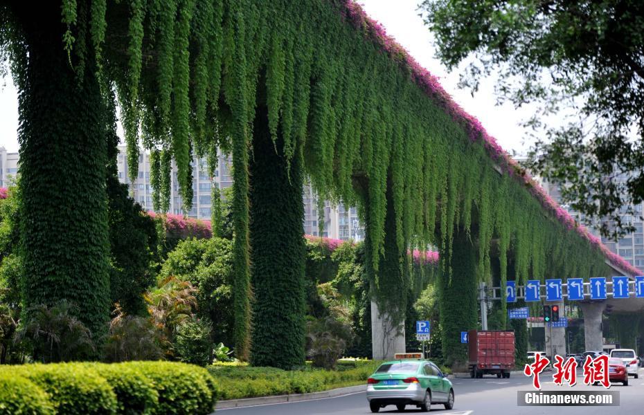 5月13日,福州市区一立交桥长满了枝叶繁茂的爬山虎,远远望去,好像穿上了一件“绿衣”,成为福州街头一景。中新社记者 张斌摄