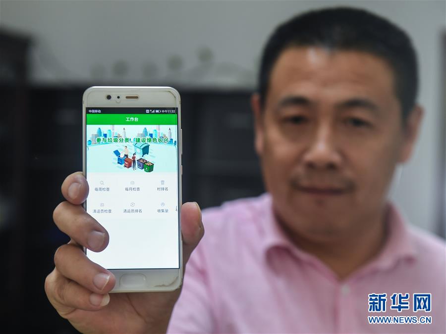 9月27日,工作人员展示垃圾分类APP的界面。从9月初开始,浙江省长兴县小浦镇推广使用手机垃圾分类智能管理平台。通过这款APP可以进行村民垃圾分类情况打分、清运员每日签到、监督员巡查等,并能即时生成农户垃圾分类“成绩单”,所有农户均可通过APP查询垃圾分类排行榜,既方便又环保。新华社记者 徐昱 摄
