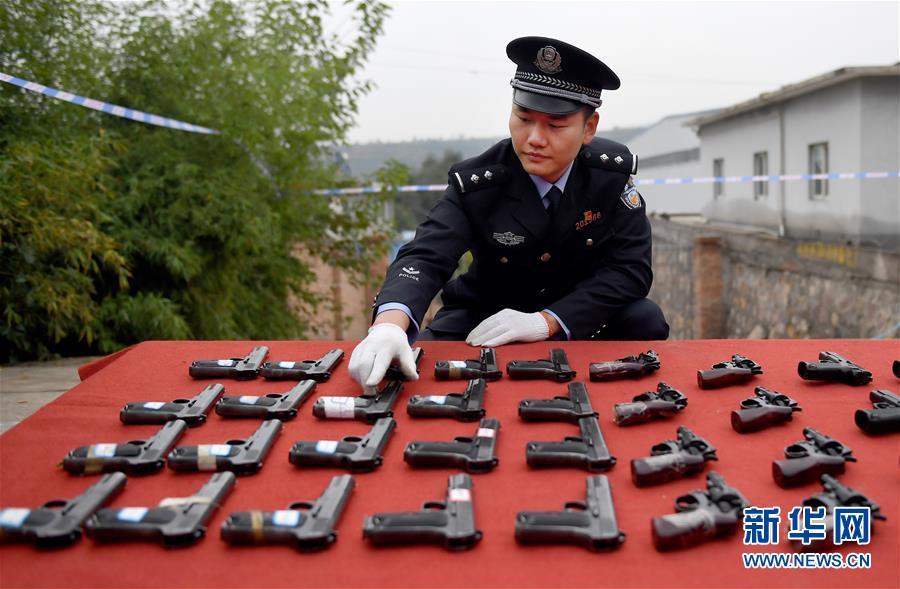9月20日,民警在陕西省铜川市集中统一销毁非法枪爆物品活动现场整理即将销毁的枪支。