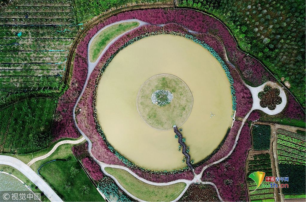 由于这些粉色乱子草围绕一个圆形的池塘种植,从空中俯瞰则是另外一番景象,湖心岛、池塘,粉黛、草坪与周边的绿色植物形成了一个特别的唯美图案。