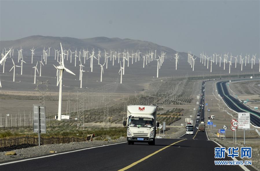 汽车行驶在新疆吐鲁番市郊区风力发电场一旁的公路上(9月22日摄)。新华社记者赵戈 摄
