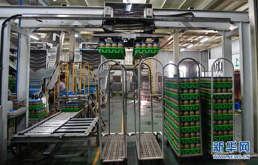 在位于清丰县的河南龙丰实业股份有限公司,“机械手”在装瓶车间自动转运食用菌栽培瓶(9月28日摄)。新华社记者冯大鹏摄