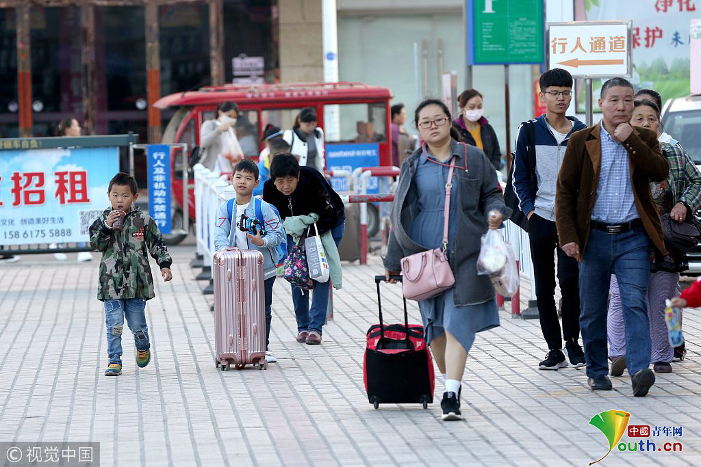 2018年10月1日,江苏淮安,国庆长假首日淮安汽车总站迎来客流高峰,出行的旅客络绎不绝。图片作者:张照久