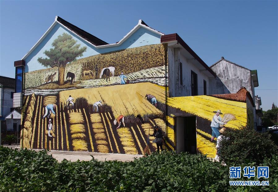 在上海市金山区吕巷镇和平村,村民房屋的墙壁上绘制了色彩艳丽、风格各异的壁画,展现田园生活景象,吸引不少游人来此参观。
