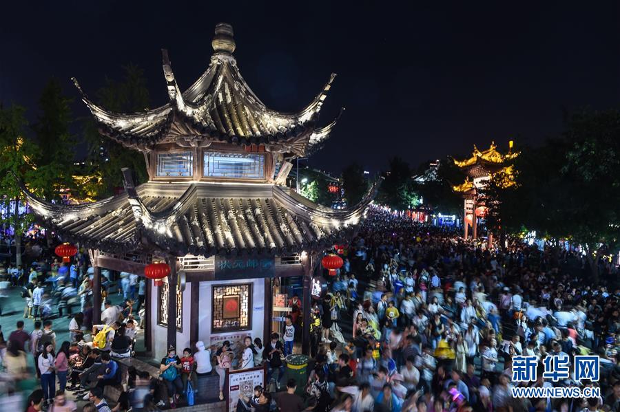 当日是国庆节假期第四天,南京夫子庙景区内游客摩肩接踵,来自全国各地的游客在秦淮河畔赏夜景、品美食,欢度国庆佳节。