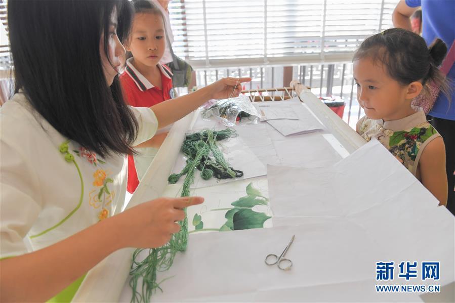 10月5日,游客在观看国家非物质文化遗产“湘绣”手工艺。 当日,“湖湘非遗文化体验展”在湖南省长沙市望城区铜官窑古镇举行,吸引众多市民和游客前去观展。展览汇聚600余件非遗文创产品,向人们展示了湘绣、剪纸、面塑等手工技艺。据悉,本次体验展将持续到10月7日。 新华社发(陈泽国 摄)