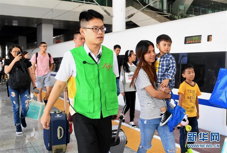 10月5日,厦门火车站铁路青年志愿者罗宁(前左)在国庆假期为旅客提供志愿服务。 新华社记者林善传摄