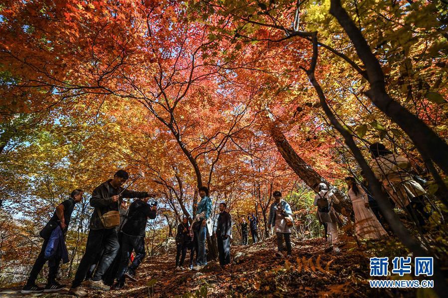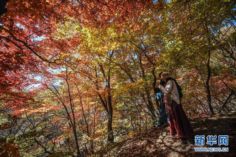 10月5日,游客在辽宁本溪老边沟风景区游览。国庆节期间,辽宁本溪老边沟风景区内的枫树正值观赏期,五彩缤纷的“枫景”吸引了众多游客前来观赏。 新华社记者潘昱龙摄