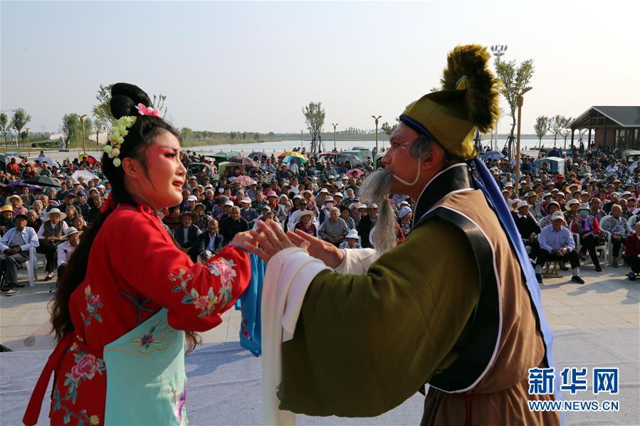 10月5日,演员在博兴县毛园村表演吕剧《姊妹易嫁》。 国庆假日期间,山东省滨州市博兴县开展“迎国庆戏曲大舞台”文化惠民演出活动,让人们在家门口就能看到精彩的戏曲节目。 新华社发(陈彬 摄)
