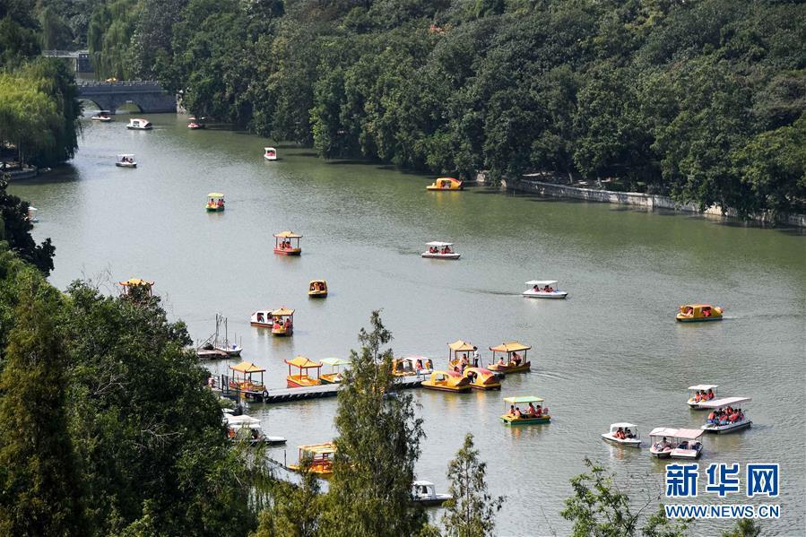 10月5日,游客在包公园内乘船游玩。 当日是国庆假期的第五天,安徽合肥天气晴好,不少市民和游客来到包公园,享受秋日惬意。 新华社记者 张端 摄