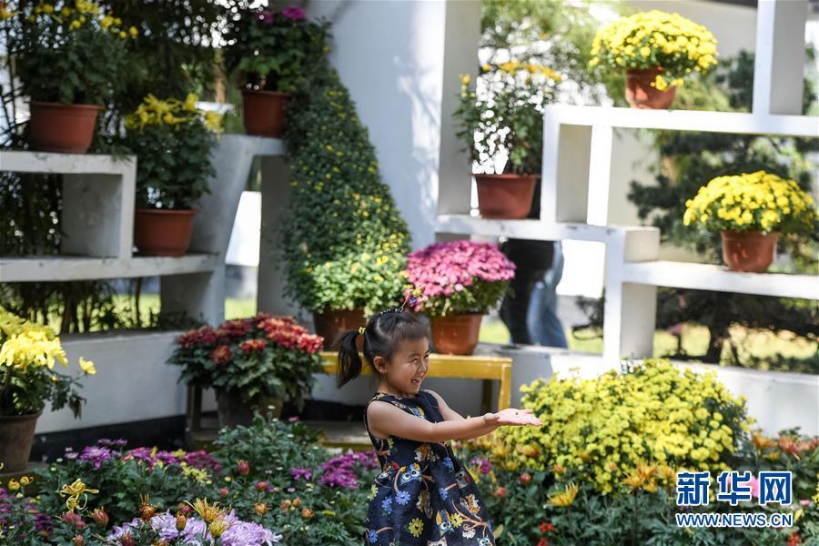 10月5日,小朋友在包公园的菊花展前留影。 当日是国庆假期的第五天,安徽合肥天气晴好,不少市民和游客来到包公园,享受秋日惬意。 新华社记者 张端 摄