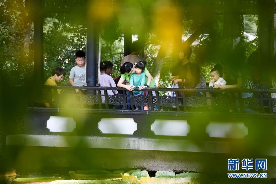 10月5日,家长带着孩子在包公园内游玩。 当日是国庆假期的第五天,安徽合肥天气晴好,不少市民和游客来到包公园,享受秋日惬意。 新华社记者 张端 摄