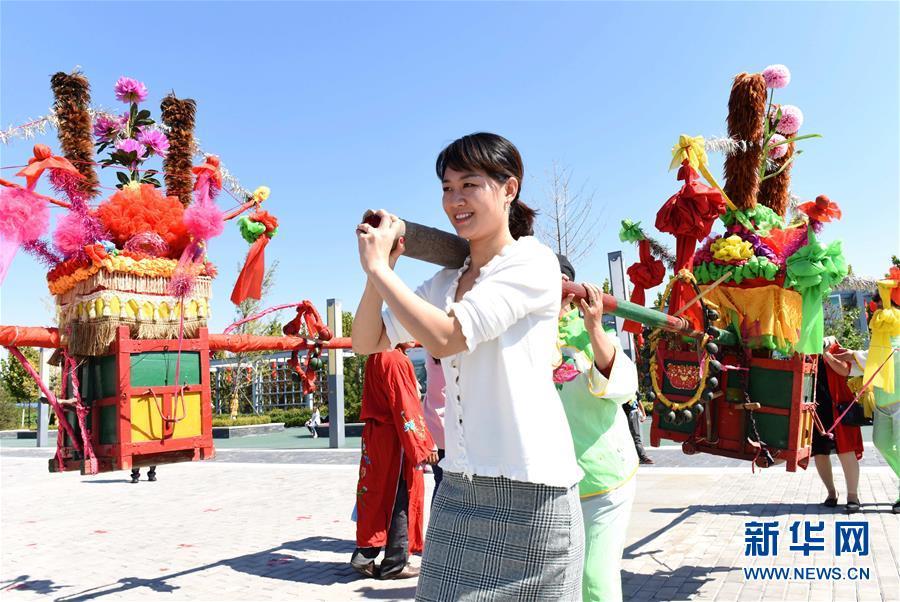 10月5日,游客在河北南和农业嘉年华体验“抬皇杠”。国庆假日期间,河北省南和县农业嘉年华景区推出农旅融合特色乡村游系列活动,吸引大批游客前来观光游览。 新华社记者 朱旭东 摄