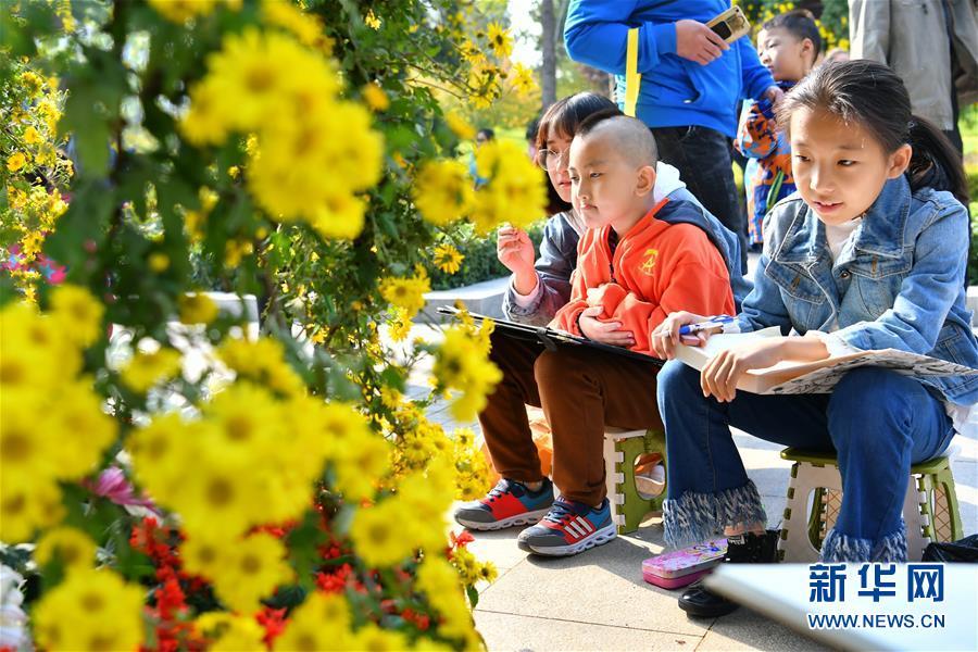 10月5日,小朋友在山西省太原市和平公园学习画菊花。国庆节期间,太原市和平公园举办菊花展,吸引了众多市民前来赏花。 新华社记者 曹阳 摄